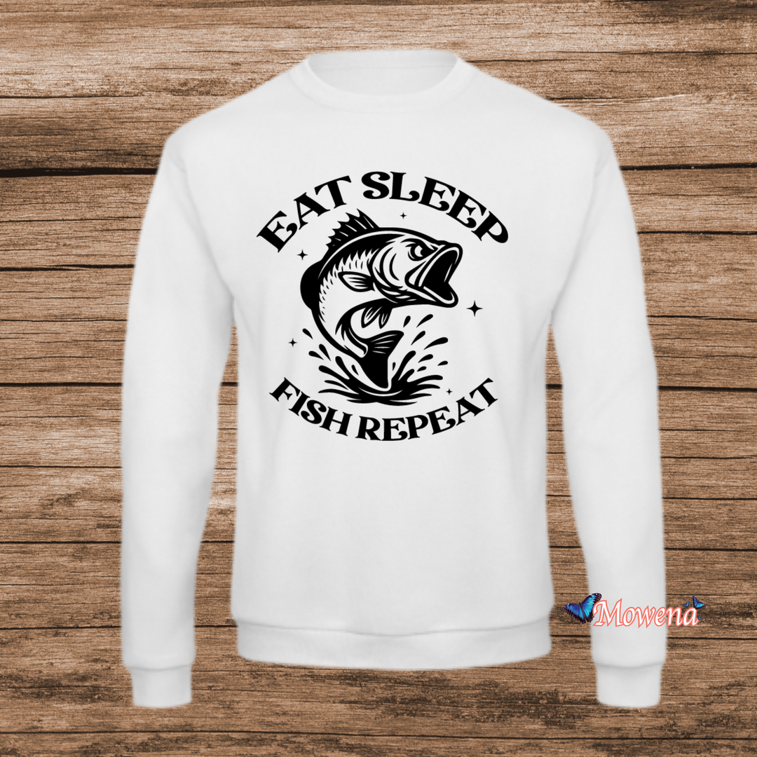 Zachte sweater met “Eat Sleep Fish Repeat”. Voor vissers die ook in koelere dagen hun passie volgen. Warm, stoer en heerlijk voor ontspannen momenten.